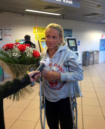 Anda Adam a fost coplesita de emotie la sosirea pe aeroport dupa eliminarea din competitia „Exatlon”. Adusa in scaun cu rotile de la scara avionului pentru a-si menaja genunchiul, indragita artista a uitat de durere si si-a imbratisat cu putere fiica, Evelin si sotul. Prima eliminata din Echipa Faimosilor s-a aratat impresionata si de prezenta unor fani care au incurajat-o si au avut doar cuvinte frumoase legate de prestatia ei din cadrul emisiunii.