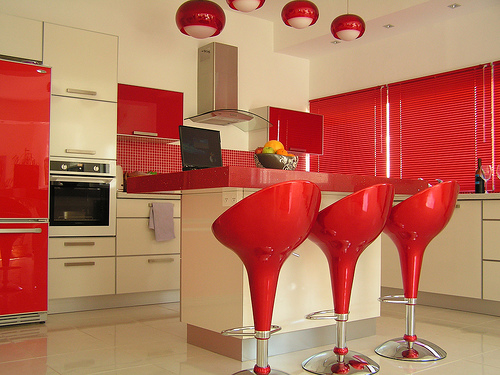 Rosul aprins se pliaza ca o manusa pentru o bucatarie plina de energie. Aceasta culoare te umple de viata si-ti deschide apetitul pentru a gati mai cu spor. In plus, rosul iese foarte repede in evidenta. Mai mult ca sigur prietenele tale vor aprecia aspectul bucatariei tale si le va face placere sa stea la o cafea cu tine. Totusi, trebuie sa ai grija ce alte nuante folosesti. Un rosu aprins se potriveste de minune cu negrul sau cu bejul.