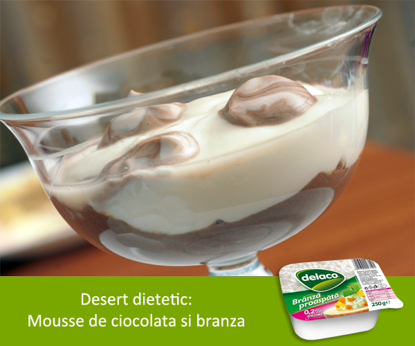 Cine spune ca ai nevoie de ingrediente exotice si multa munca pentru un desert delcios, care sa fie pe placul tuturor? Ai nevoie doar de 5 minute pentru a realiza un mousse de ciocolata si branza proaspata Delaco. Oricand simti nevoia de ceva dulce, iti poti prepara acest desert dietetic, care nu iti va afecta silueta si, in plus, iti va furniza si necesarul zilnic de calciu.