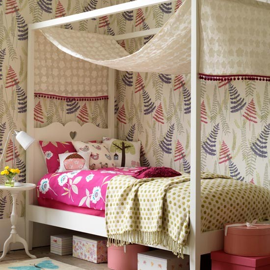 Cand cei mici devin cei mari si se desprind de prima copilarie, dormitorul de demult trebuie rearanjat. Se vor potrivi perfect un pat de lemn alb cu „acoperis” decupat si incadrat de o perdea ce coboara spre saltea, tapetul indraznet, masuta pentru veioza si multe cutii de depozitare. Tapetul floral cu mov si roz arata in continuare feminin, dar potrivit pentru o adolescenta.