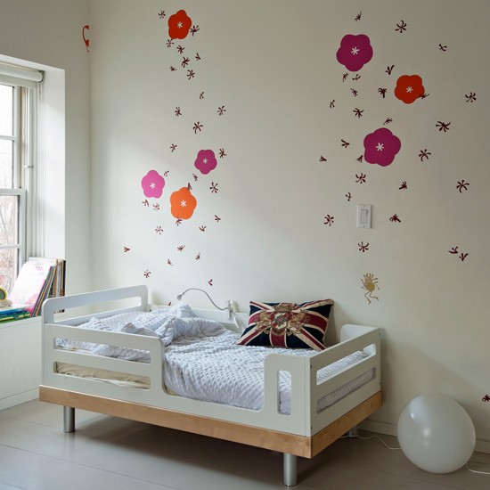 Culorile simple si non-culorile din acest dormitor sunt un background relaxant si neutru pentru un tapet floral. Arta decorarii peretilor a luat amploare si in Romania, unde poti gasi tineri designeri care deseneaza adevarate tablouri in camerele copiilor, in functie de tematica data. Preturile variaza de la cateva sute de lei, la cateva sute de euro, in functie de acoperire si de materialele folosite.