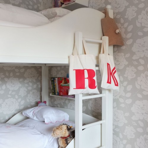 Patul alb suprapus se incadreaza perfect in decorul cu tapet vintage de culoare gri, creand un paradis traditional, dar si modern pentru micuti, indiferent ca sunt baieti sau fetite.