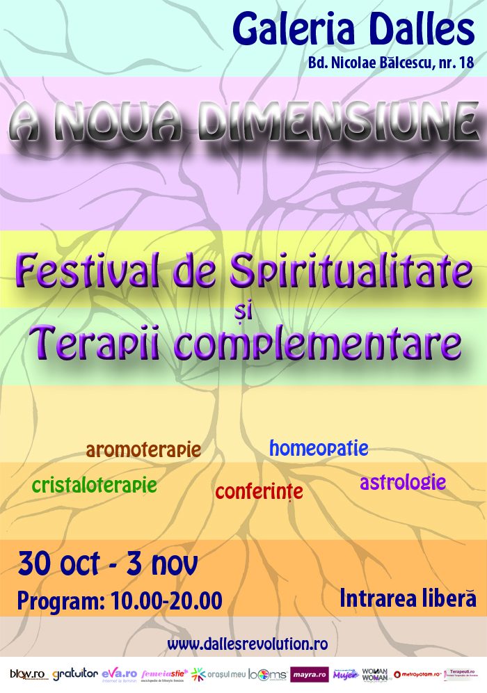 Festivalul de Spiritualitate - afisIncepand cu 30 octombrie, Sala Dalles, va fi gazda unui eveniment special ce abordeaza o latura a vietii constientizata mai putin in goana noastra spre „a avea”: Festivalul de Spiritualitate si Terapii Complementare, “A Noua Dimensiune”