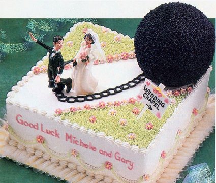 Exista miri care isi doresc insa lucruri mai unice de atat. Michele si Gary, de exemplu, au dorit o reprezentare a iubirii lor transpusa in frisca, ciocolata si fondant. Ce poate fi mai simbolic si mai gustos decat o bila si o lant gros care atarna de piciorul bietului mire?